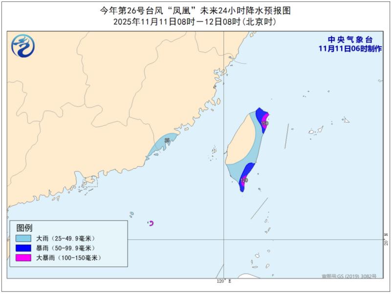 降水预报:11日8时到12日8时,福建东南部、台湾岛东部和南部将有大到暴雨,其中台湾岛东北部和东南部地区有大暴雨(100—150毫米)。