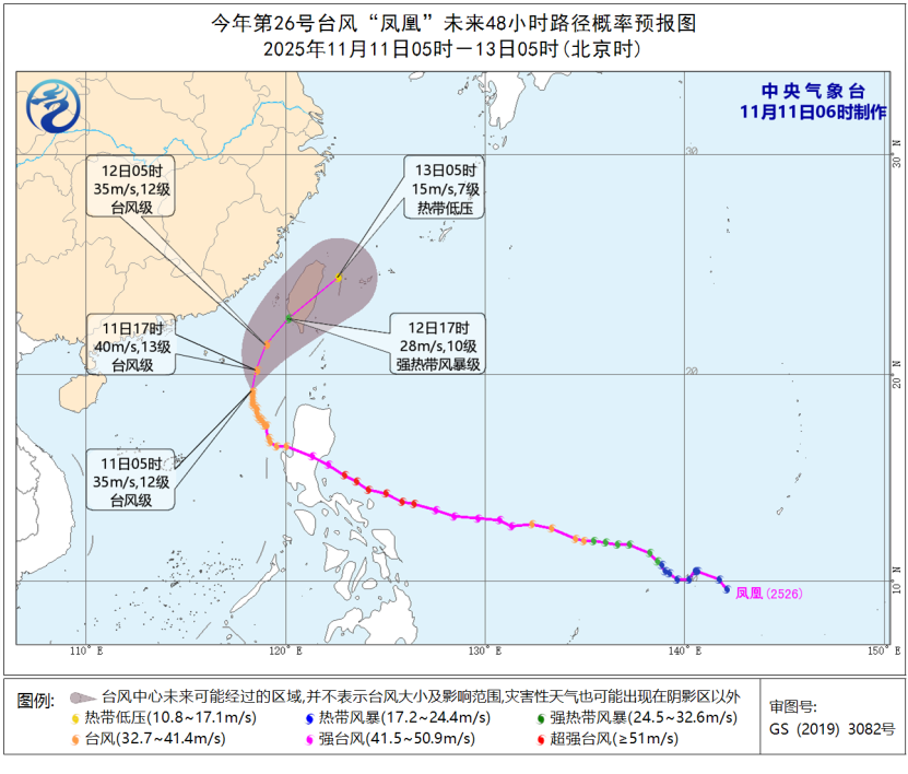 大风预报:11日8时到12日8时,东海南部海域、台湾以东洋面、黄岩岛、中沙群岛、南海大部、浙江沿海、福建沿海、广东沿海、台湾岛沿海将有6—8级、阵风9—10级的大风,台湾海峡、巴士海峡、南海东北部和中东部的风力可达9—11级,阵风12—13级,台风“凤凰”中心经过的附近海域和地区风力可达12—13级,阵风14—15级。