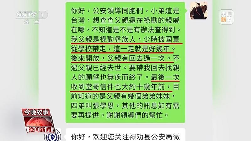 这场会面缘起于今年6月份。一条来自海峡对岸的求助信息,出现在了云南昆明禄劝县警方微信公众号的后台。发出这条信息的正是台胞张学庭。张学庭的父亲张鸿恩是云南禄劝彝族人,年少时被国民党军队带到台湾后,便与家人断了联系。80年代末,父亲回过家乡一次,也和家人有了书信往来,但十几年前父亲去世后,又断了联系。