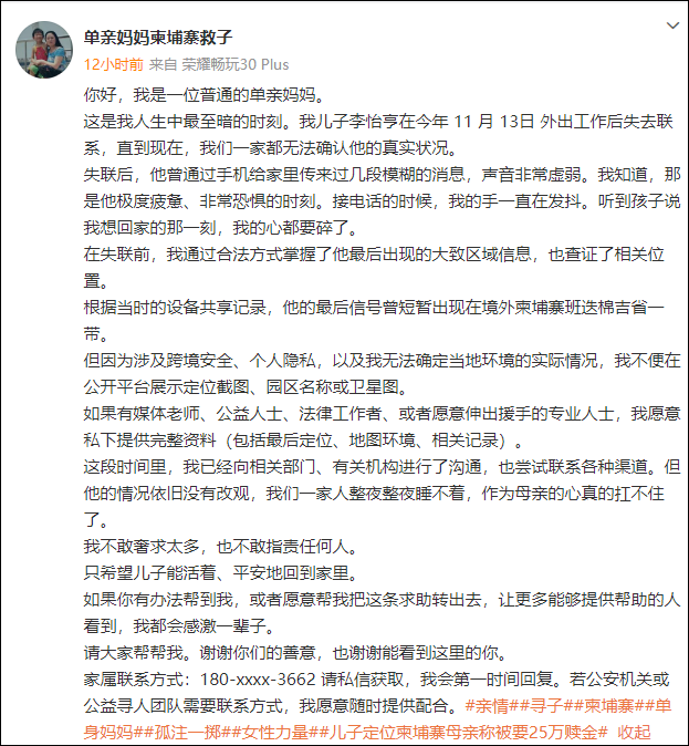@单亲妈妈柬埔寨救子 发布的信息显示,其儿子李怡亨最后信号曾短暂出现在境外柬埔寨班迭棉吉省一带,“失联后,他曾通过手机给家里传来过几段模糊的消息,声音非常虚弱。”“直到现在,我们一家都无法确认他的真实状况。”
