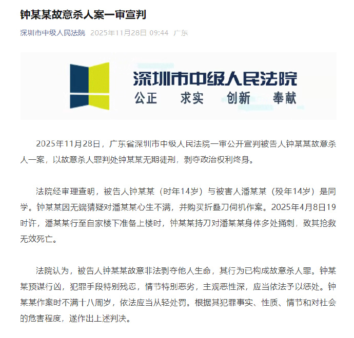 2025年11月28日,广东省深圳市中级人民法院一审公开宣判被告人钟某某故意杀人一案,以故意杀人罪判处钟某某无期徒刑,剥夺政治权利终身。