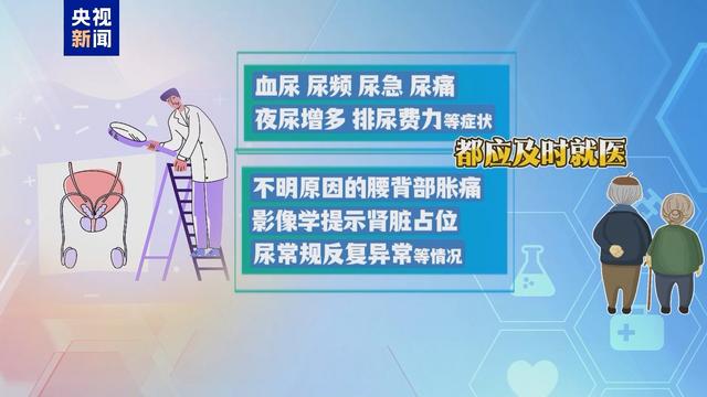 老年人尤其需要警惕身体发出的警示信号。如出现血尿、尿频、尿急、尿痛、夜尿增多、排尿费力等症状,或不明原因的腰背部胀痛、影像学提示肾脏占位、尿常规反复异常等情况,都应及时就医。