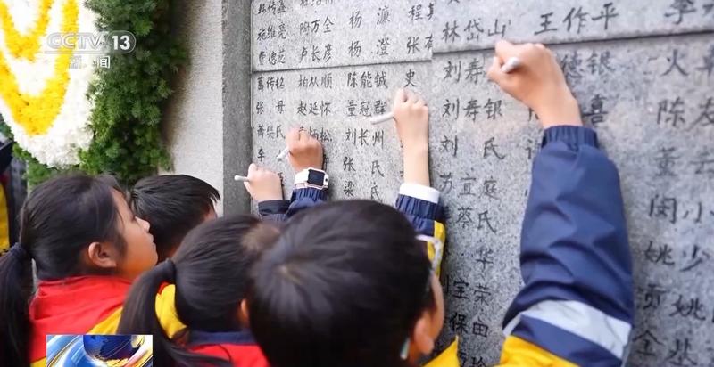 南京大屠杀历史记忆传承人 常小梅:在描这个名字的时候,也是仿佛我在亲近我的祖母和祖父,以及我的几个叔叔。虽然墙是冰冷的,但是我们对亲人的思念是有温度的,所以我觉得每一次来到这里,仿佛我就是在跟亲人进行一个面对面的对话,今天我是有责任和义务将这段历史让更多的人去知道,去了解,让我们共同来守护和平。