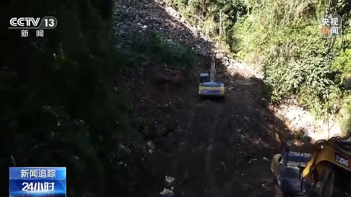 总台央视记者 陈允涛:在山谷的谷底,从这儿可以更清楚地看到剖面,我们发现比想象中的更陡峭,将近有80度左右。我面前的这些垃圾经过十几年左右的堆放,一些垃圾已经开始分解,现场也能闻到刺鼻的味道。挖掘机遇到了一个新的问题,在施工的过程中发现有块巨石有松动的风险。施工人员准备上去安装雷管,爆破之后再进行作业。