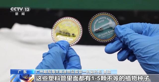 广州邮局海关邮递物品监管一科副科长 曹勋:我们打开邮件包裹之后,发现里面是一件白色上衣。上衣包裹着用彩色卡纸贴着的塑料管和塑料密封袋。我们开拆之后也发现,塑料管里面都有1~5颗不等的植物种子。经送技术机构鉴定之后,发现这些植物种子都是大麻种子。