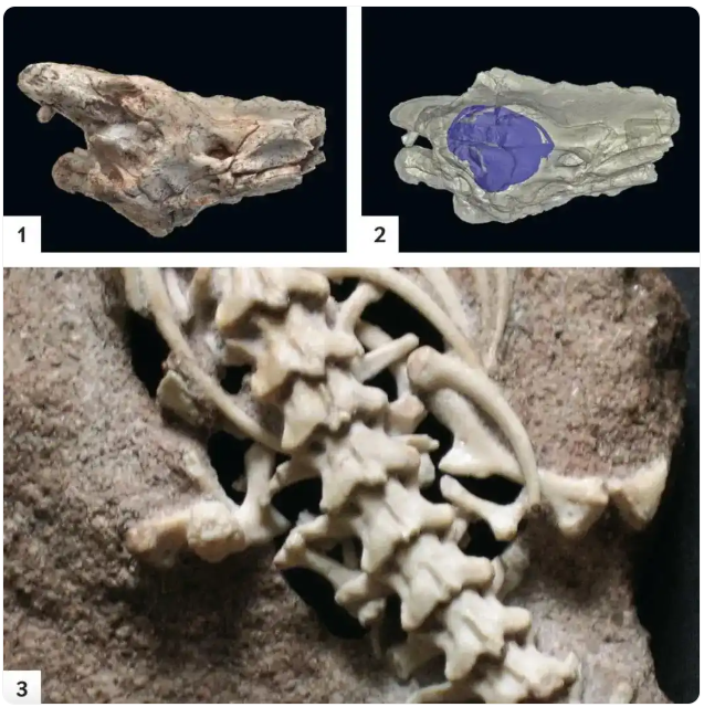 △图1图2为Dinilysia patagonica的头骨,图3为保留后肢的蛇的骨骼。图源:Scientific American官网。而在约9000万年前的其他蛇类