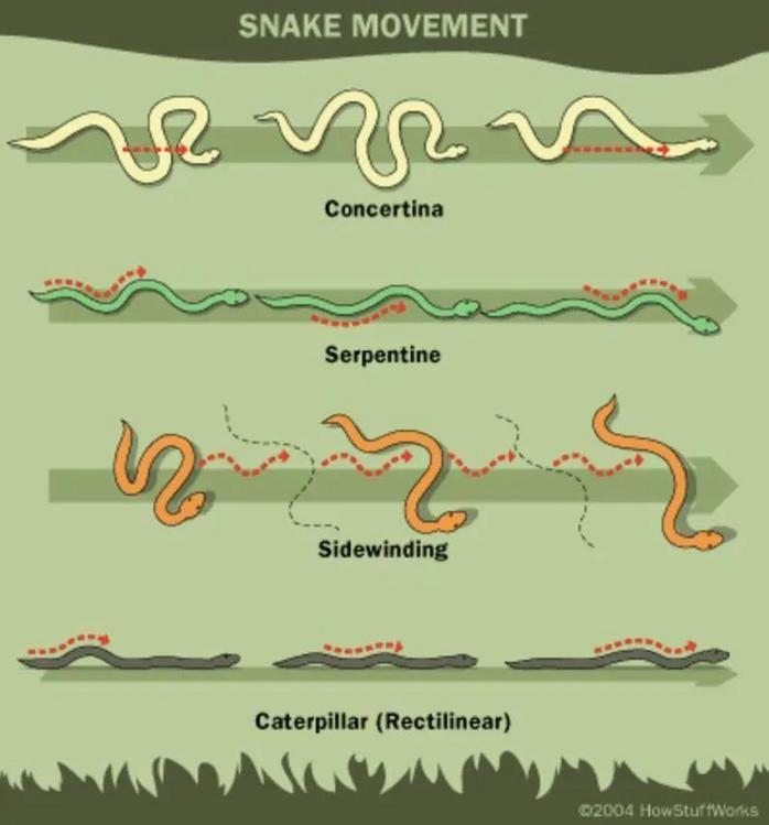 △从上到下依次为风琴式、波浪式、侧行式、直蠕式。图源:WordPress网站。蛇类的脊椎骨数量远超哺乳动物