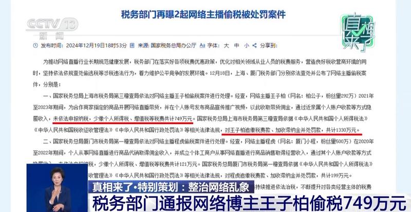 2024年5月,国家税务总局上海市税务局第三稽查局发现,王子柏申报收入与其直播带货销量严重不匹配,后查实其偷税749万元,最终被追缴税费、加收滞纳金并处罚款共计1330万元‌。