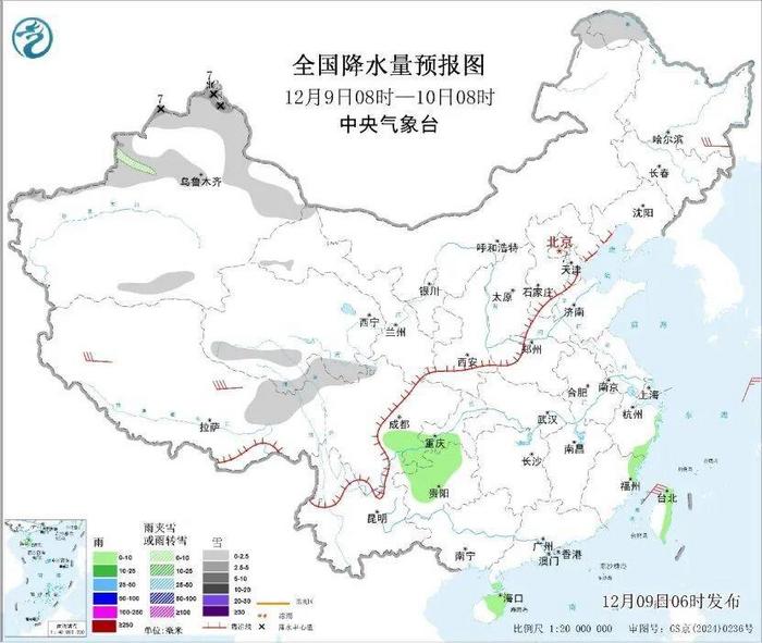 预计今天(12月9日),全国大部天气以晴或多云为主,雨雪偏少。黑龙江西北部、新疆北部、西藏东部、青海南部等地部分地区有小雪或雨夹雪,其中,新疆北疆北部的部分地区有中雪,局地大雪或暴雪(10至12毫米)。