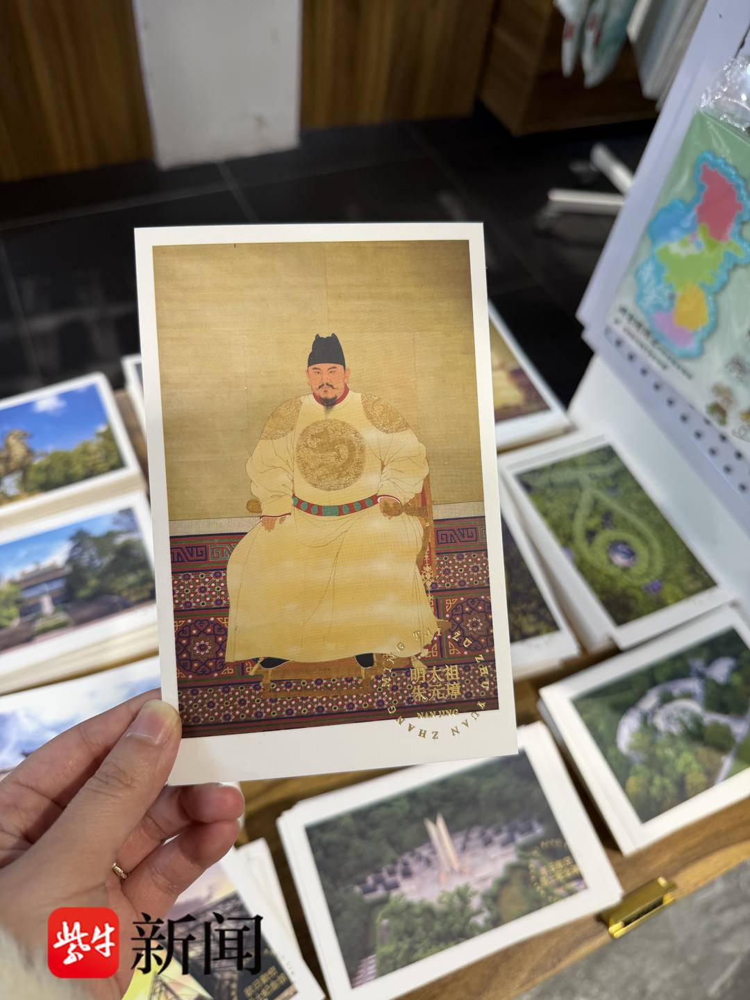 在明孝陵博物馆,不仅墙上的画像采用了教材“同款”,连文创产品也凸显了太祖的英明神武。工作人员介绍,明太祖朱元璋的文创有明信片和立牌两种,从文创设计之初,选用的就是较为帅气的朱元璋形象,而非“鞋拔子脸”形象,且很受欢迎。立牌设计了朱元璋、朱棣和朱祁镇三人的形象,“朱元璋的后代都是比较正常且英武的脸型,比较帅气的这张画像和其他两位摆在一起才更和谐嘛!”