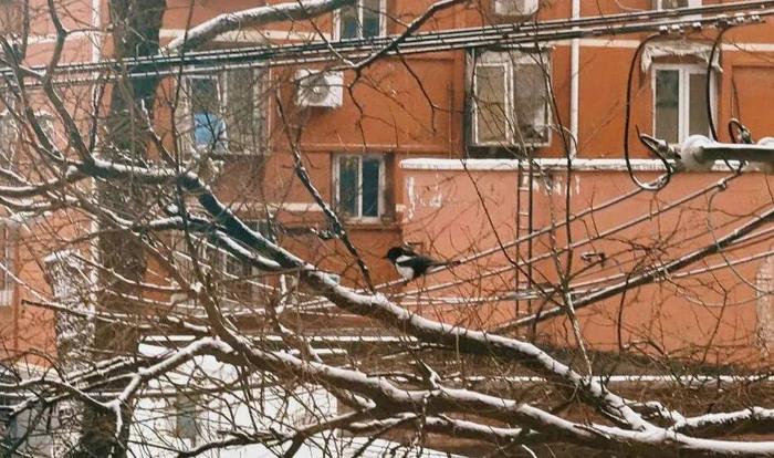 雪后北京小区,喜鹊落于覆雪枝头。经济日报记者姬凌波摄