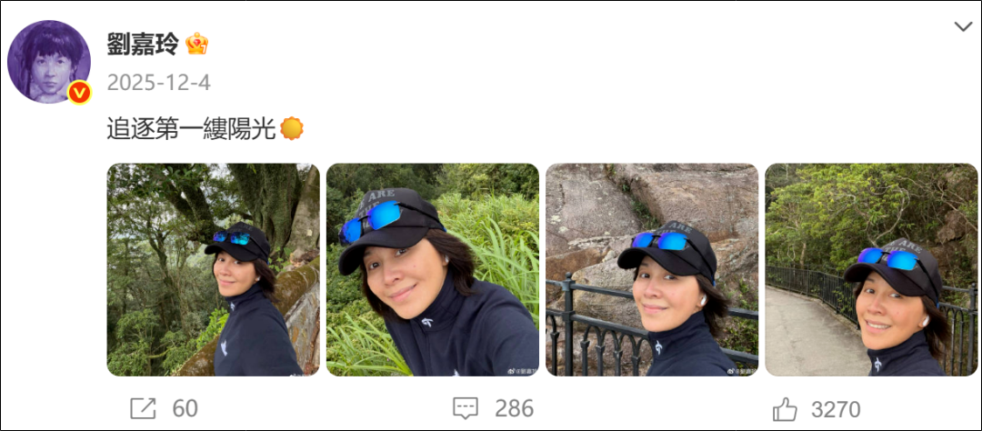 照片中刘嘉玲一身运动装扮,据了解,刘嘉玲有晨跑的习惯,经常在社交媒体晒出晨跑照片。