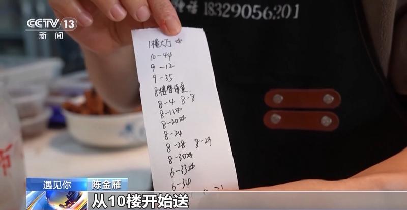 小满家面馆店主 陈金雁:一开始送餐的时候没有贴这个单子,就容易送错,所以后面我们也想了很多办法,包括后面餐食越来越多,我们就会做这样的一张总单,从10楼开始送,一楼一楼这样送下来。