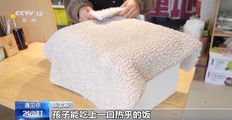 餐食准备好,保温是关键。陈金雁的妈妈亲手缝制了加厚的棉褥,仔细地盖在装满餐盒的泡沫箱上。