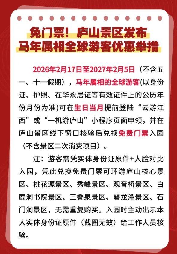 “庐山风景名胜区”微信号5日发文称,2026年2月17日至2027年2月5日(不含五一、十一假期),马年属相的全球游客可在生日当月提前登录小程序页面申领,并在庐山景区线下窗口核验后兑换免费门票入园。