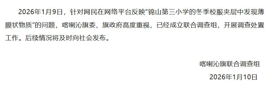 中新网1月10日电 据“喀喇沁融媒体”微信公众号消息,内蒙古赤峰市喀喇沁旗联合调查组1月10日上午发布情况通报:2026年1月9日,针对网民在网络平台反映“锦山第三小学的冬季校服夹层中发现薄膜状物质”的问题,喀喇沁旗委、旗政府高度重视,已经成立联合调查组,开展调查处置工作。后续情况将及时向社会发布。