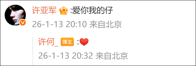 许亚军在儿子贴文下评论:爱你我的仔。