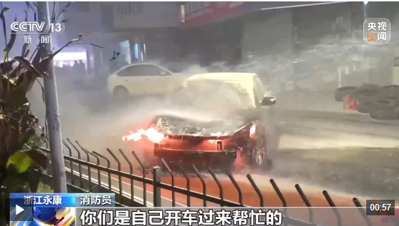 在众人扑救下,明火被暂时压制。然而,几分钟后,火又复燃……这时,一辆洒水车又赶来加入救援队伍,持续对起火车辆洒水降温,直至消防员赶到。