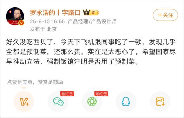 这场引发广泛关注的隔空交锋,始于四个月前。2025年9月10日,罗永浩公开吐槽西贝菜品“几乎全是预制菜且价格高”,并特别以一道“冷冻有机西蓝花”为例,引发消费者对西贝产品品质与定价的质疑。