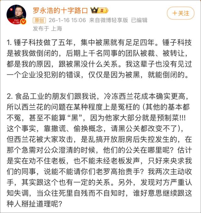 1月16日下午15:06,罗永浩发布长文,以自己创办锤子科技的经历进行类比,称“锤子科技是被我做倒闭的……跟被黑没什么关系”,并指出“没见过一个企业没犯别的错误,仅仅是因为被黑,就能倒闭的”。