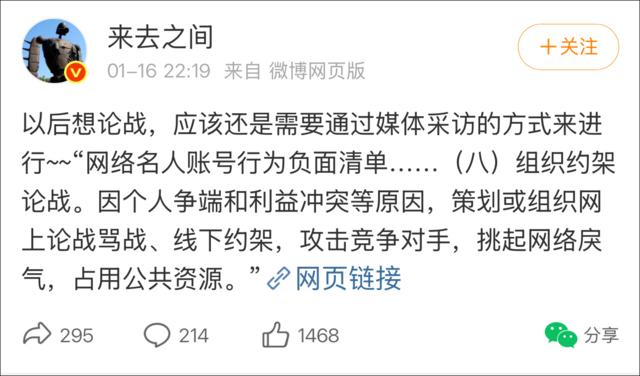 目前,贾国龙与罗永浩的个人微博账号均被禁言。微博CEO“来去之间”发布微博:以后想论战,应该还是需要通过媒体采访的方式来进行~~“网络名人账号行为负面清单……(八)组织约架论战。因个人争端和利益冲突等原因,策划或组织网上论战骂战、线下约架,攻击竞争对手,挑起网络戾气,占用公共资源。”