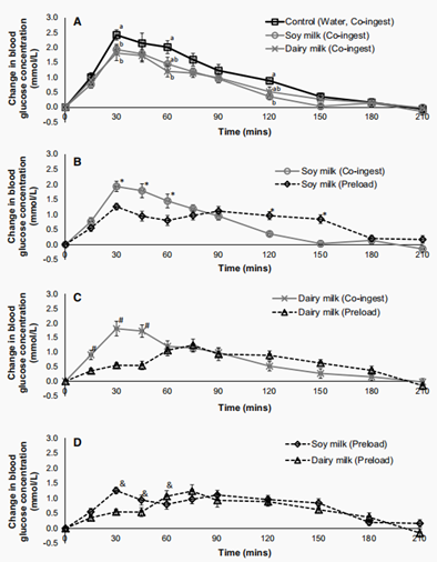 图 A:面包+水、面包+牛奶、面包+豆奶同时吃喝的曲线;图 B:先喝豆奶和豆奶面包一起吃的比较;图 C:先喝牛奶和牛奶面包一起吃的比较;图 D:同样先喝牛奶与先喝豆奶的比较。