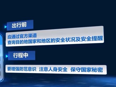 出行前,应通过官方渠道,查询目的地国家和地区的安全状况及安全提醒。行程中,要增强防范意识,注意人身安全、保守国家秘密,不参与、不协助任何可能损害我国国家利益的行为。