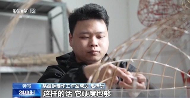某醒狮制作工作室成员 赵梓乐:我们一般是挑那种细一点、够硬的竹子去扎狮头,这样的话它硬度够,重量也能达到我们预想效果。因为有狮子是跳梅花桩,让狮子跳跃更轻松。