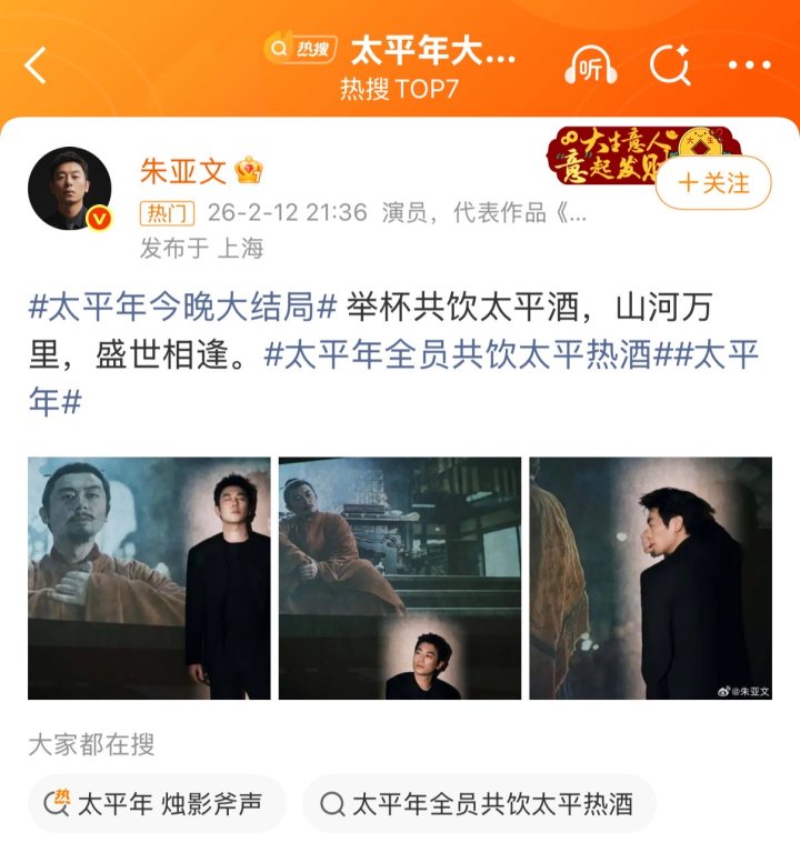 饰演赵匡胤的朱亚文发文:“举杯共饮太平酒,山河万里,盛世相逢。”