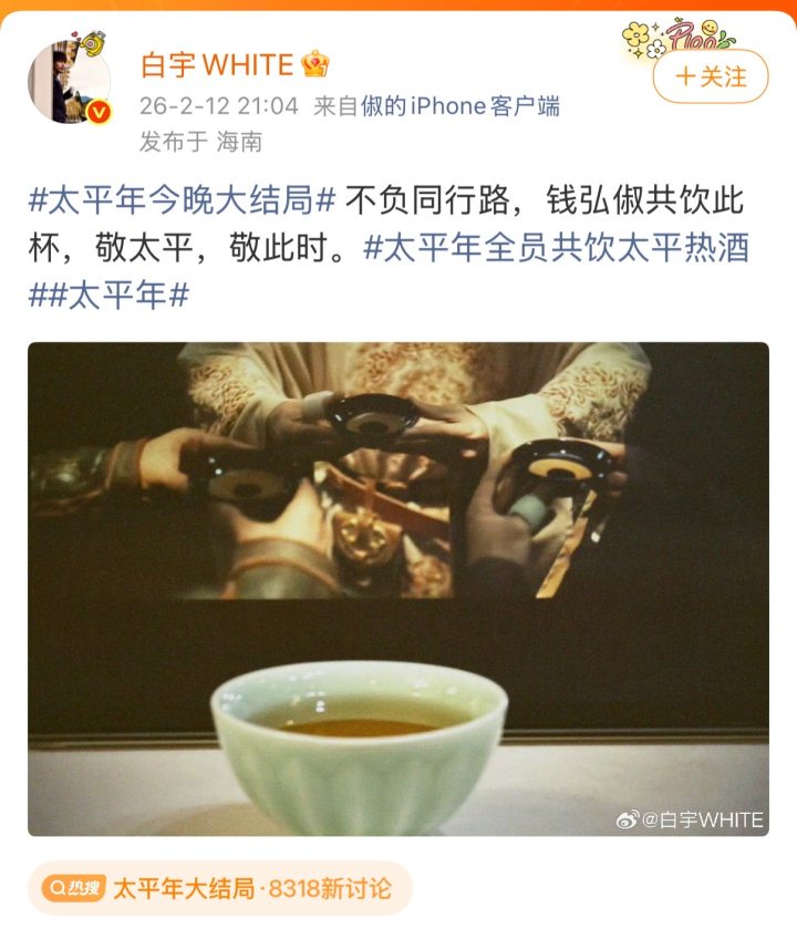 饰演钱弘俶的白宇发文:“不负同行路,钱弘俶共饮此杯,敬太平,敬此时。”