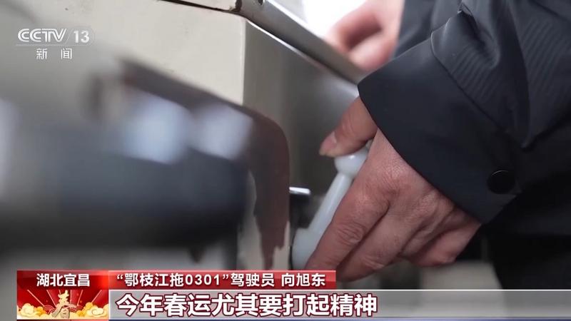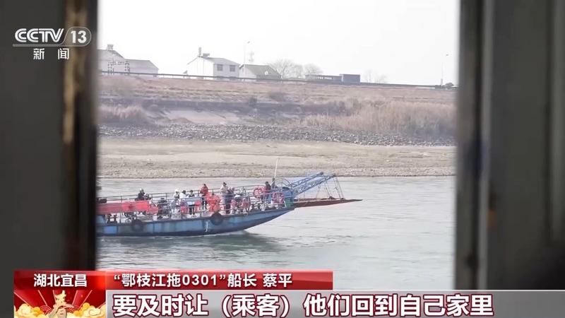 “鄂枝江拖0301”船长 蔡平:水上工作就是以船为家,每天天明到天黑,从事水上行业40年,可能说今年是最后一个轮渡上的春节。要及时让乘客回到自己家里和家人团聚,这就是我们船队的工作原则和理念。