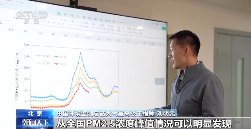 中国环境监测总站大气室高级工程师 刘明元:从全国PM2.5浓度峰值情况可以明显发现,从除夕的1时,到初一的23时,PM2.5浓度是经过了一个非常清晰的先上升后下降的过程。2026年较去年,下降了大概三到四成。