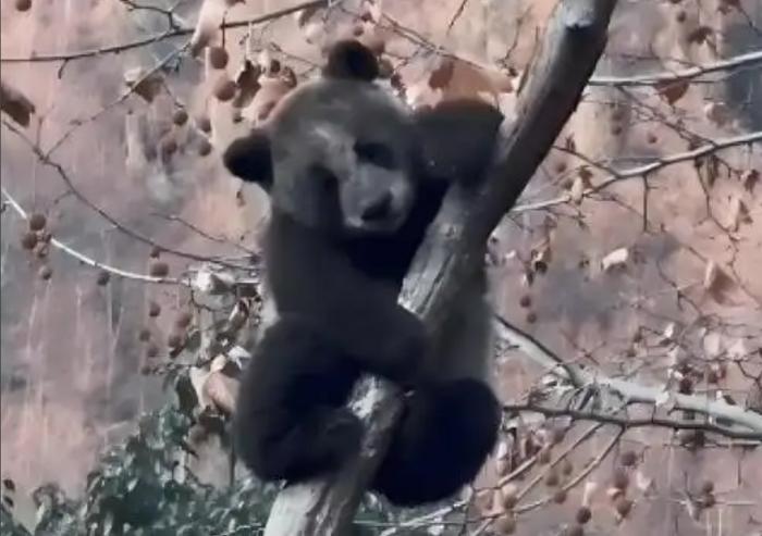 图片和视频中,浑身“黢黑”的大熊猫趴在树枝上,黑乎乎的模样与人们印象中黑白分明的大熊猫截然不同,俨然一副下矿挖煤后的模样。