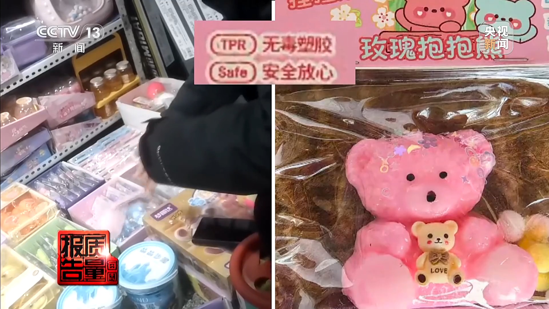 在一家店铺,记者看到一款名为“玫瑰抱抱熊”的捏捏乐玩具,包装上印着“无毒塑胶、安全放心”的字样。