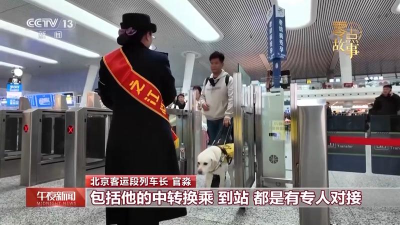 北京客运段列车长 官淼:现在随着铁路,包括社会上对视障旅客的关心关爱,配套设施的完善,可以说是全程无忧了。我们接到工单以后,从他进站乘车,包括中转换乘、到站,都是有专人对接。