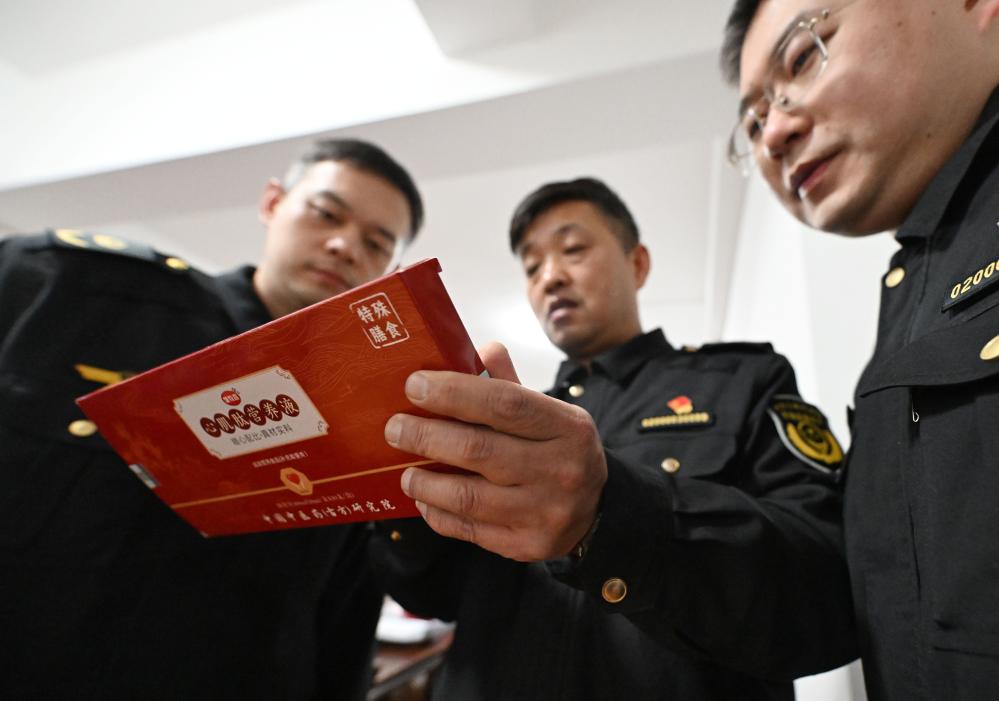 天津市市场监管综合行政执法总队工作人员在查看涉案的直播间产品。新华社记者赵子硕 摄