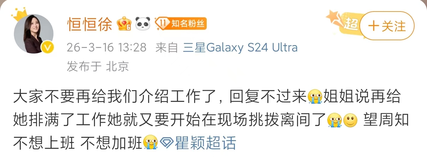 翻红后,她不仅婉拒了大量媒体采访,也没有第一时间出现在直播间“321上链接”。相反,她的经纪人更在社交媒体公开喊话,“大家不要再给我们介绍工作了……望周知,不想上班,不想加班。”