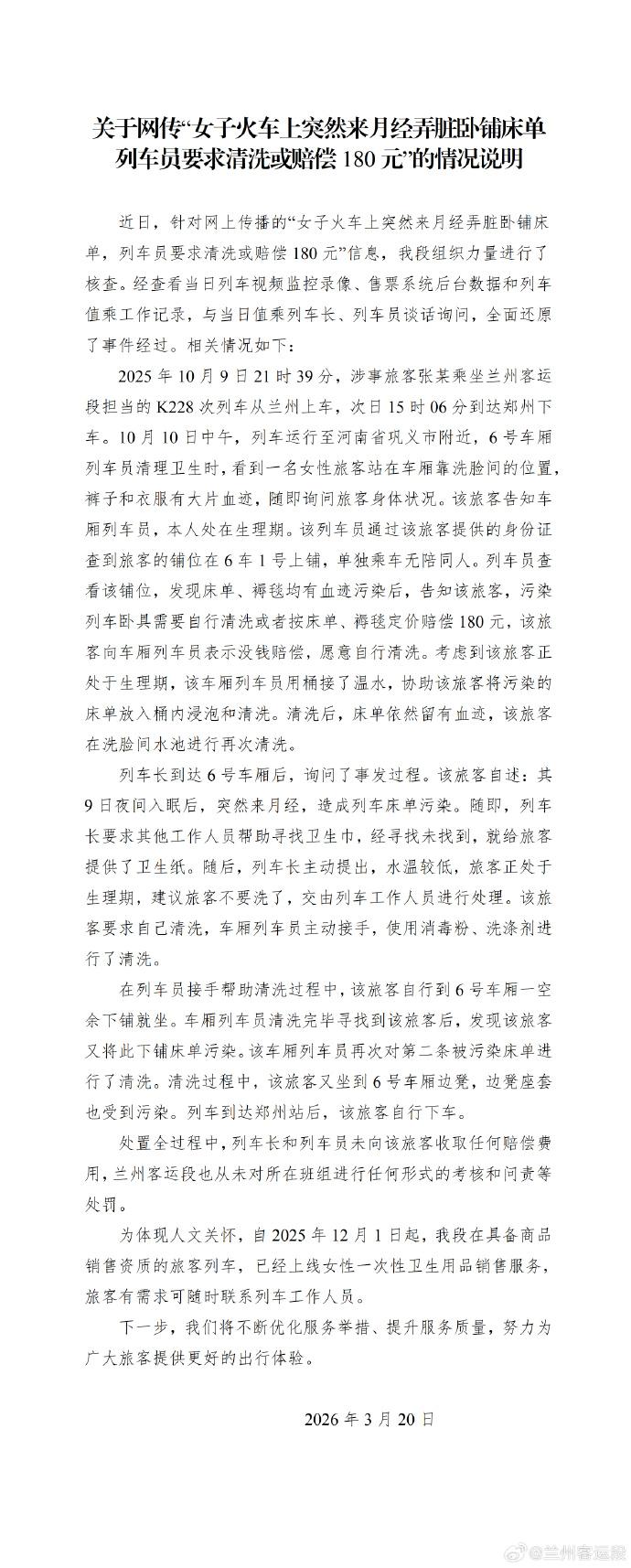 3月20日,@兰州客运段 发布关于网传“女子火车上突然来月经弄脏卧铺床单,列车员要求清洗或赔偿180元”的情况说明: