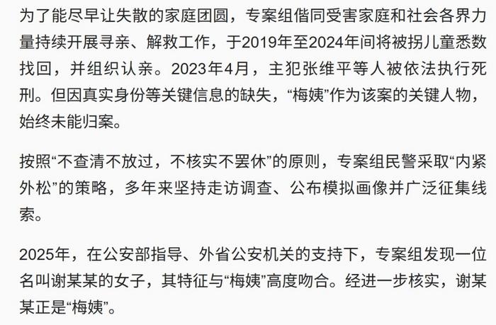 央视新闻讯 3月21日,记者从广州市公安局了解到,经警方不懈努力,“张维平等人拐卖儿童案”取得重大进展,犯罪嫌疑人谢某某(女)落网,其即为该案关键人物“梅姨”。
