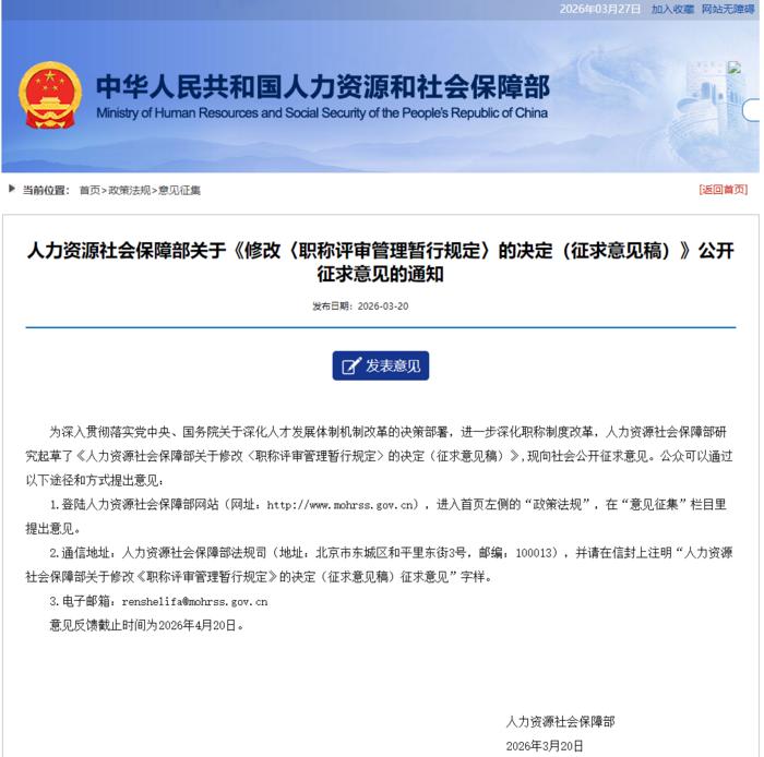 近日,人力资源和社会保障部研究起草了《人力资源社会保障部关于修改〈职称评审管理暂行规定〉的决定(征求意见稿)》,正在向社会公开征求意见,意见反馈截止时间为2026年4月20日。