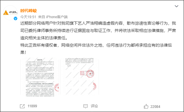 27日晚,@时代峰峻 官方微博发布律师声明: