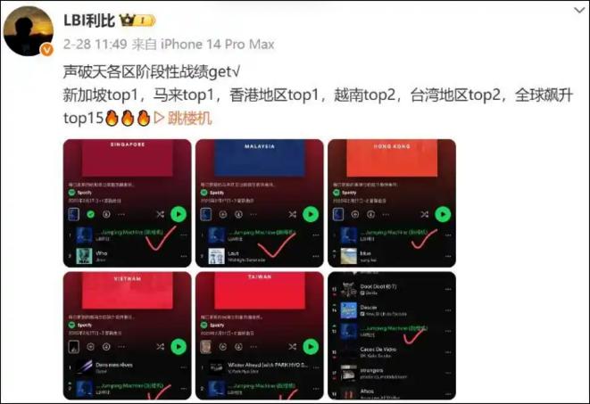 《跳楼机》于2025年1月23日上线海外流媒体,截至2025年6月3日,其在Spotify的播放量已经超过5400万。此前歌手LBI利比曾在今年2月28日发文称,《跳楼机》在各区阶段性战绩为:新加坡top1,马来top1,香港地区top1,越南top2,台湾地区top2,全球飙升top15。