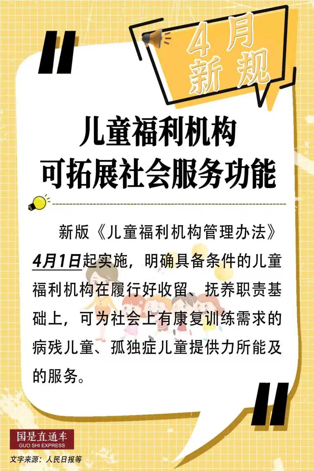 新版《儿童福利机构管理办法》4月1日起实施,明确具备条件的儿童福利机构在履行好收留、抚养职责基础上,可为社会上有康复训练需求的病残儿童、孤独症儿童提供力所能及的服务。