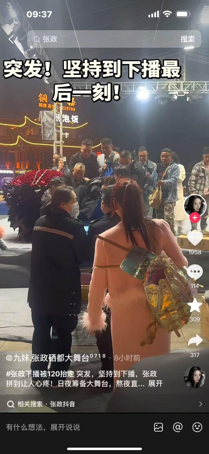 都市快报橙柿互动讯 3月31日晚,湖北恩施,“硒都大舞台”直播后台。歌手张政在完成直播后突然捂住胸口,对工作人员大喊,“不要碰我,我这里痛”,随后抽搐晕倒,现场人员立即拨打急救电话,张政被救护车送往医院。