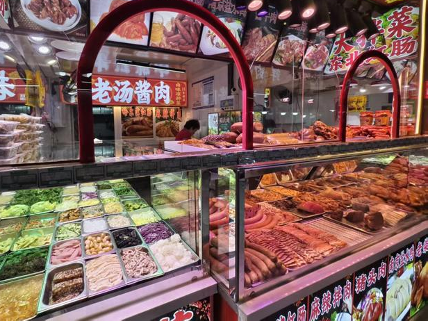 部分档口还使用不同颜色的照明灯,例如一家熟食档口,凉拌菜上方使用的是类似紫色和白色的照明光源,而旁边的熟食托盘上方则是暖黄色的光源,让不同菜品呈现不同质感。