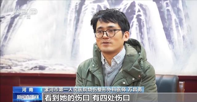 漯河市第一人民医院烧伤整形外科医师 万昌勇:看到她有四处伤口,最长的就是左侧的下颌缘,一直到骨头了,下颌这个地方就到颈阔肌,可能再砍伤2毫米就到我们的面动脉了。