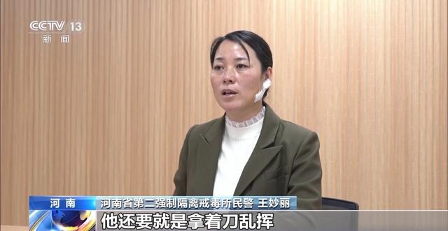 河南省第二强制隔离戒毒所民警 王妙丽:我说“把刀放下,我是警察”。我亮出警官证,他非但没有停止还拿着刀乱挥,朝我这个方向挥过来。在和他搏斗的过程中,我一脚把他的刀踢到地上。