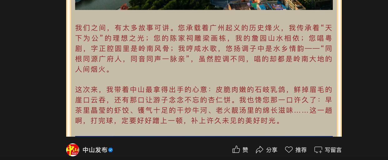 “我带着中山最拿得出手的心意:皮脆肉嫩的石岐乳鸽鲜掉眉毛的崖口云吞还有那口让游子念念不忘的杏仁饼”