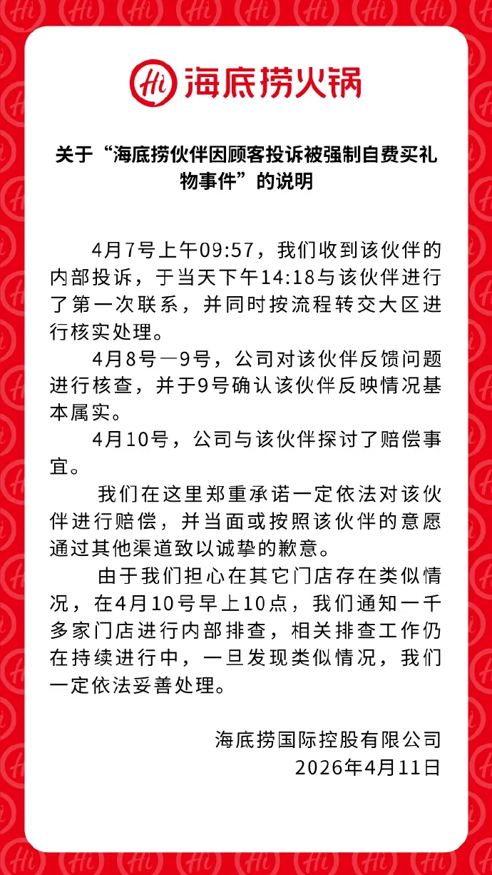 (原标题:海底捞最新通报“强制员工自费买礼物”事件:共四起涉及1237.9元已全部返还,未来将弱化门店考核)