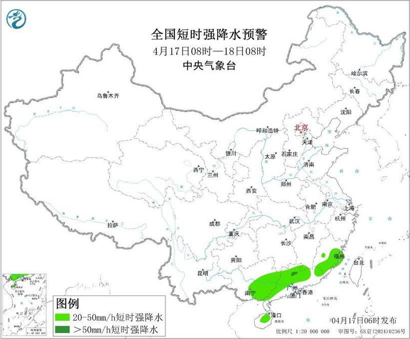 预计,4月17日08时至18日08时,广西东部和南部、广东中北部、福建东南部等地部分地区有大雨,其中,广西东部、广东北部、福建东南部等地部分地区有暴雨(50~90毫米)。上述部分地区伴有短时强降水(最大小时降雨量20~40毫米,局地可超过50毫米),局地有雷暴大风或冰雹等强对流天气。